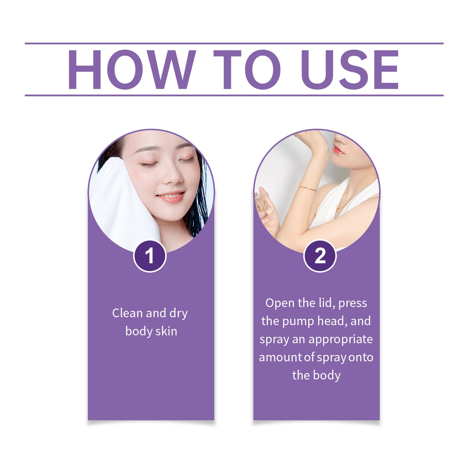 Our lavender body perfume spray contains gardenia extract, Panthenol Gardenia extract, panthenol. It relieves stress, soothes skin, and keeps you in a good mood. Its application is simple: clean and dry body skin, open the lid, press the pump head, and spray the right amount of spray onto the body. And can be quickly attracted, constantly radiate charm.