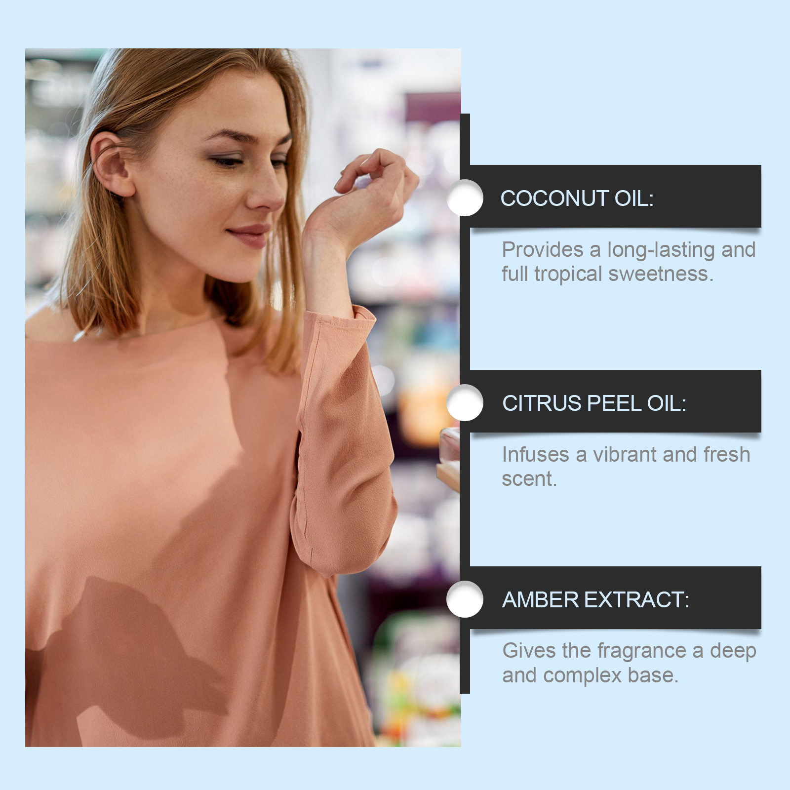 Our Citrus Oriental Fragrance contains coconut oil, citrus peel oil and amber extract. It can inject vitality and color into everyday life. Deep mystery, enhance the charm of the overall fragrance. Its application is simple: 1. Spray the perfume on the wrists, neck and behind the ears. 2. You can spray perfume in the air, then step into the fog and let the perfume spread evenly all over your body, leaving the scent behind. Delivers long-lasting and complete tropical sweetness. Infused with a vibrant and refreshing scent. Gives the fragrance a deep and complex undertone.